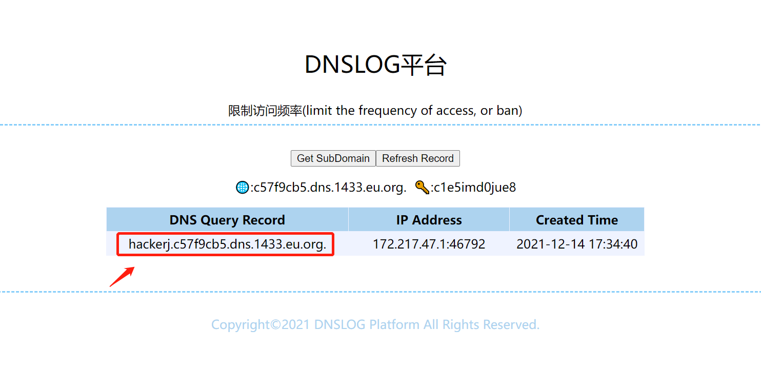 我们通过JNDI注入请求DNSLOG的恶意语句,如果在DNSLOG端能查看到访问记录,则证明远程代码执行漏洞存在