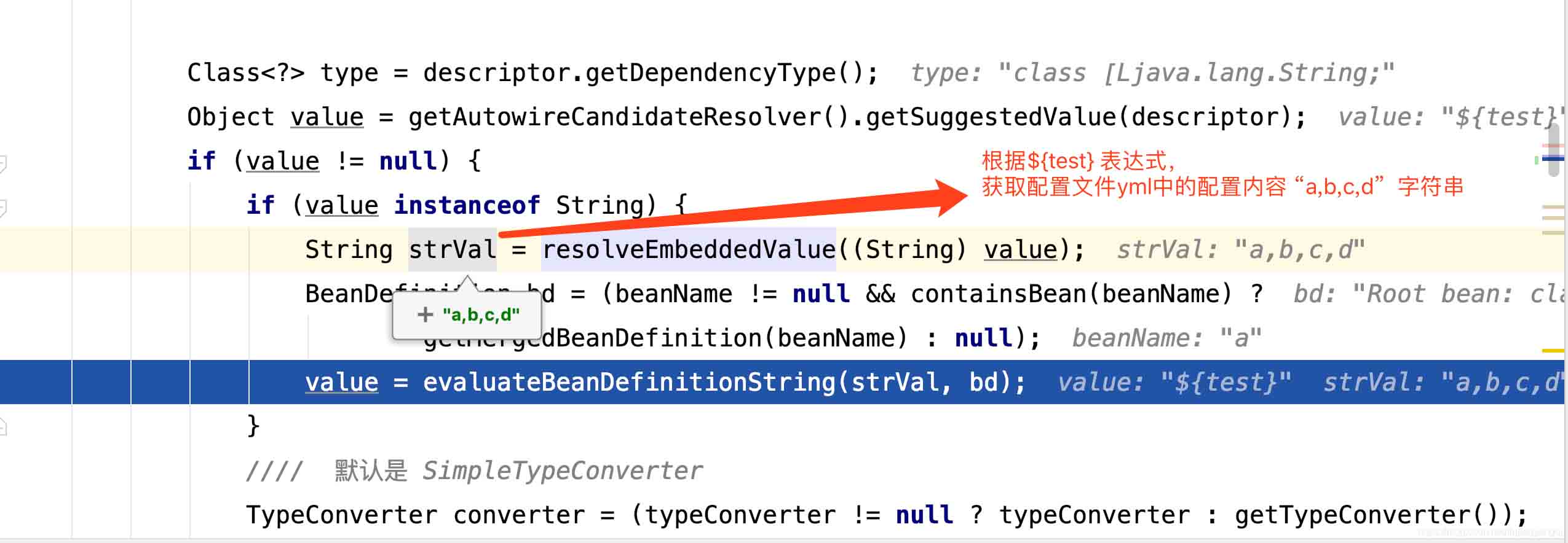 /// 通过断点调试,我们可以发现我们在配置文件yml中配置的 “a,b,c,d”字符串已经变成了一个String[]数组