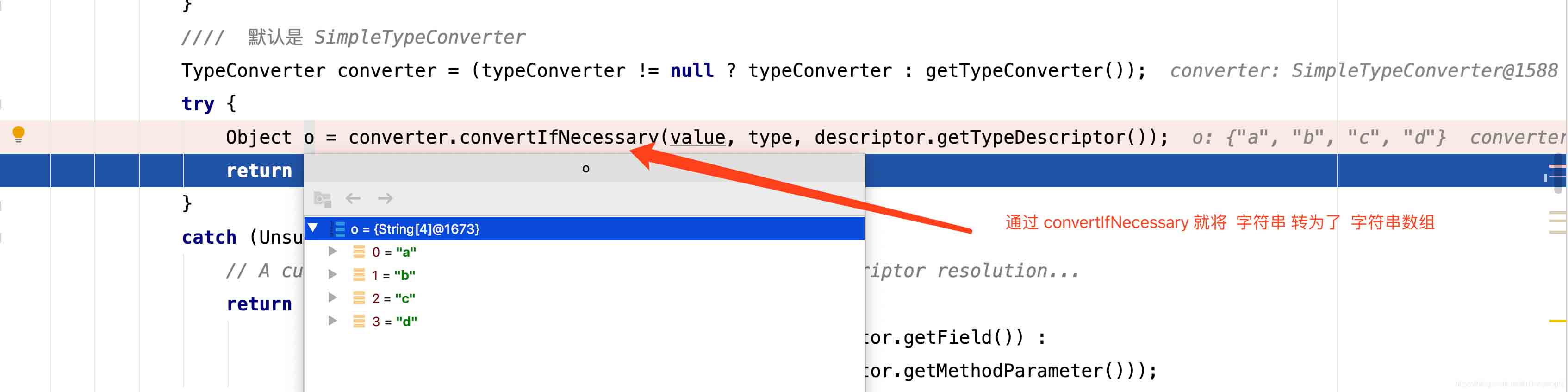然后通过这个类型转换器的convertIfNecessary方法把,我们的字符串"a,b,c,d"转换成了String[]数组。