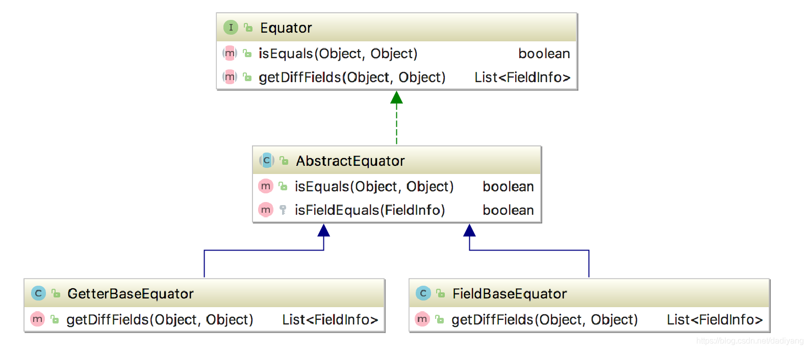 使用反射对传入的对象进行比对,提供了基于字段的比较器和基于 Getter 方法的对比器,并且充分考虑扩展性,使用者可以重写字段的比对规则。功能相对简单,代码实现也不难,而且做了很多注释,具体实现可以直接查看源码。