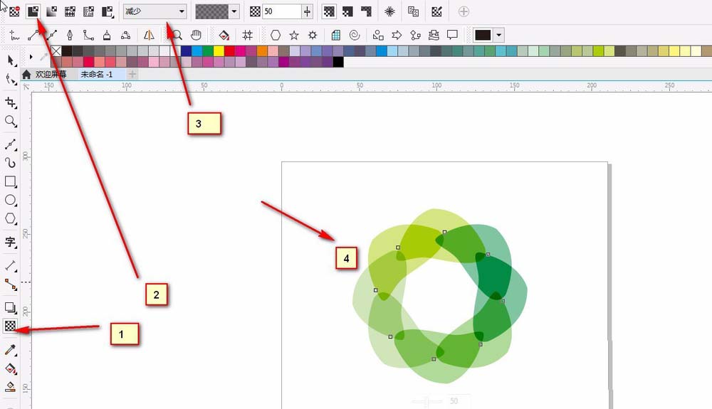 4、填充颜色,两个花瓣一个颜色。分别填充:①#A1CB76浅绿色②#A9CB05草绿色③#028A44墨绿色④#61B431;全选,鼠标右键××,去掉轮廓色。