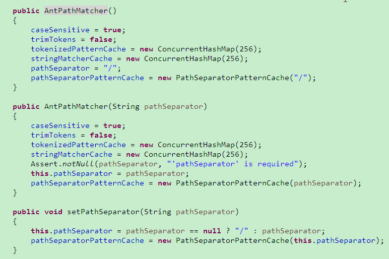 (2)匹配文件路径,使用AntPathMatcher创建一个对象时,需要注意AntPathMatcher也有有参构造,传递路径分隔符参数pathSeparator,对于文件路径的匹配来说,则需要根据不同的操作系统来传递各自的文件分隔符,以此防止匹配文件路径错误。源码截图如下: