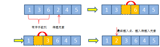 将待插元素,依次与已排序好的子数列元素从后到前进行比较,如果当前元素值比待插元素值大,则将移位到与其相邻的后一个位置,否则直接将待插元素插入当前元素相邻的后一位置,因为说明已经找到插入点的最终位置