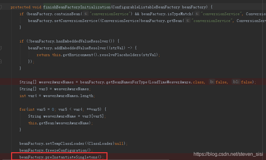 3. 进入AbstractApplicationContext类中finishBeanFactoryInitialization()方法,找到preInstantiateSingletons()