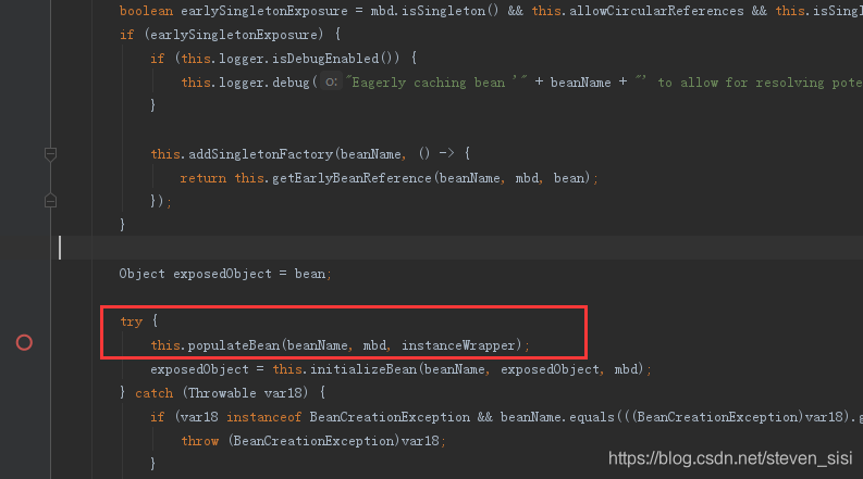 1. 在AbstractAutowireCapableBeanFactory类doCreateBean()方法中,找到populateBean()方法,从名字可知是用来填充bean的