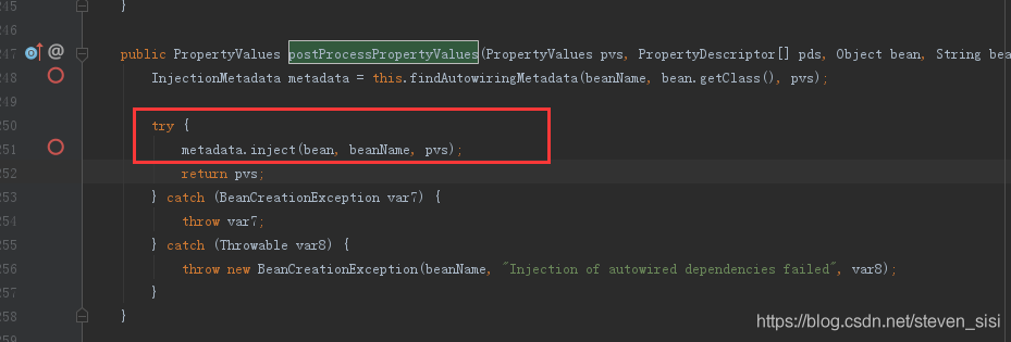 2. 在AbstractAutowireCapableBeanFactory类中populateBean()方法,找到postProcessPropertyValues()方法