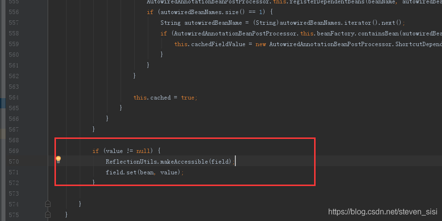 5. 进入AutowiredAnnotationBeanPostProcessor类inject方法中,找到field.set(bean, value)方法,通过反射将值设置到属性中
