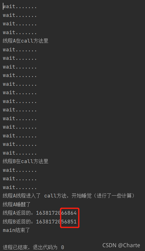 由上图两个线程返回的时间差约等于10秒可以看出,当一个线程(线程B)需要等待(一直wait…)另一个线程(线程A)把某个任务(进行了一些计算)执行完后它才能继续执行,此时可以使用FutureTask。不管futureTaskA.get()和futureTaskB.get()谁在前面,输出结果一定是“线程B返回的:xxx”在“wait…”的后面。假设有多个线程执行若干任务,每个任务最多只能被执行一次。当多个线程试图同时执行同一个任务时,只允许一个线程执行任务,其他线程需要等待这个任务执行完后才能继续执行。