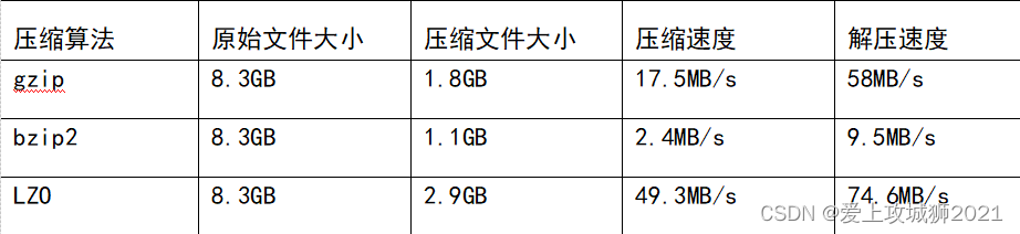 注:(LZO是Hadoop通用的编解码器,其设计目标是达到与硬盘读取速度相当的压缩速度,因此速度是优先考虑的因素,其次是压缩率,LZO的压缩速度是Gzip的5倍,解压速度是Gzip的2倍)