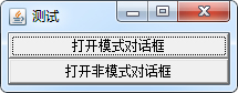 不管是模式对话框还是非模式对话框,打开后都无法关闭它们,因为程序没有为这两个对话框写事件监听器。如果主程序需要对话框里接收的输入值,则应该把对话框设置成模式对话框,因为模式对话框会阻塞该程序;如果把对话框设置成非模式对话框,则可能造成对话框被打开了,但用于并没有操作该对话框,也没有向对话框里进行输入,这就会引起主程序的异常。