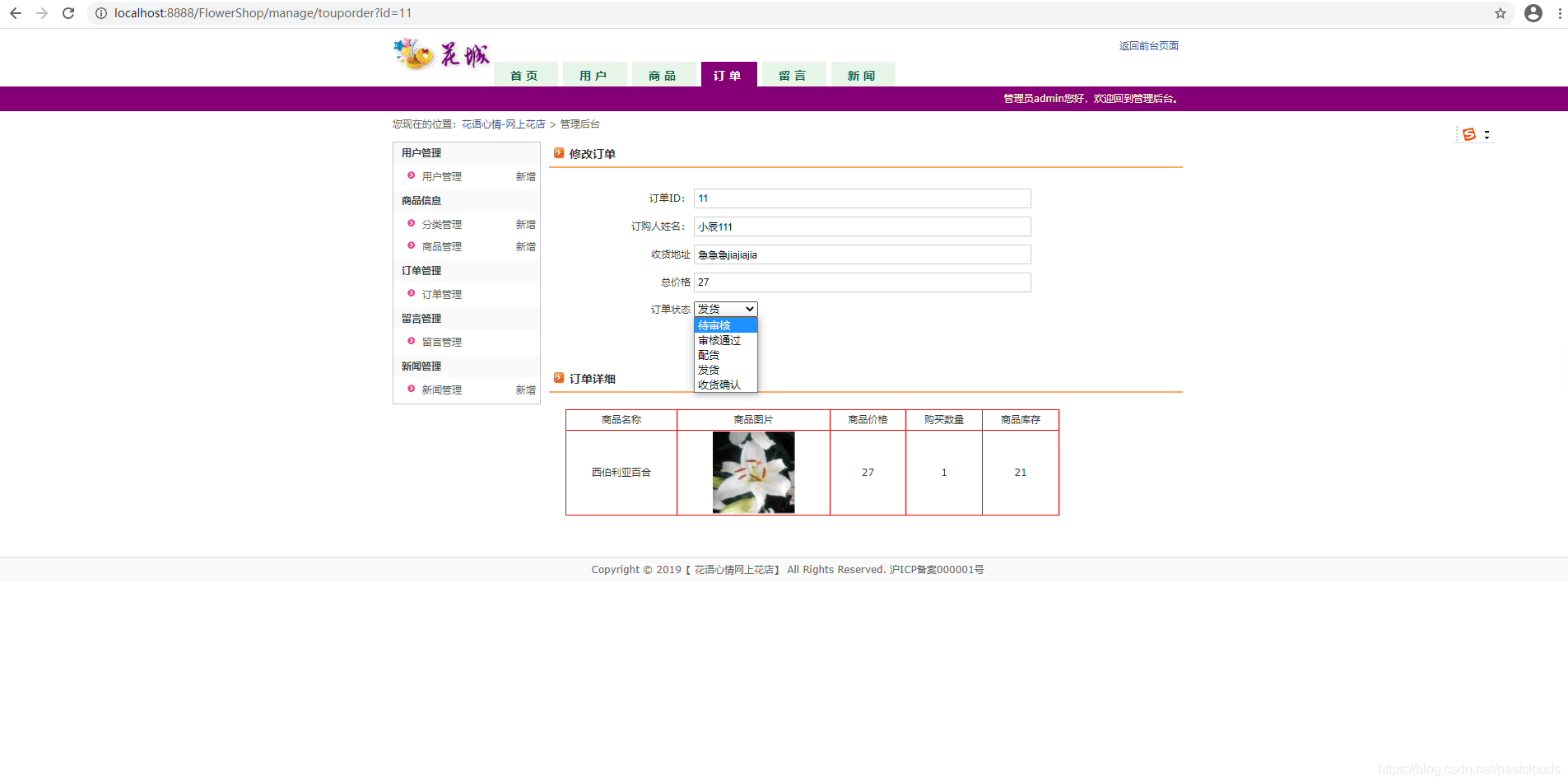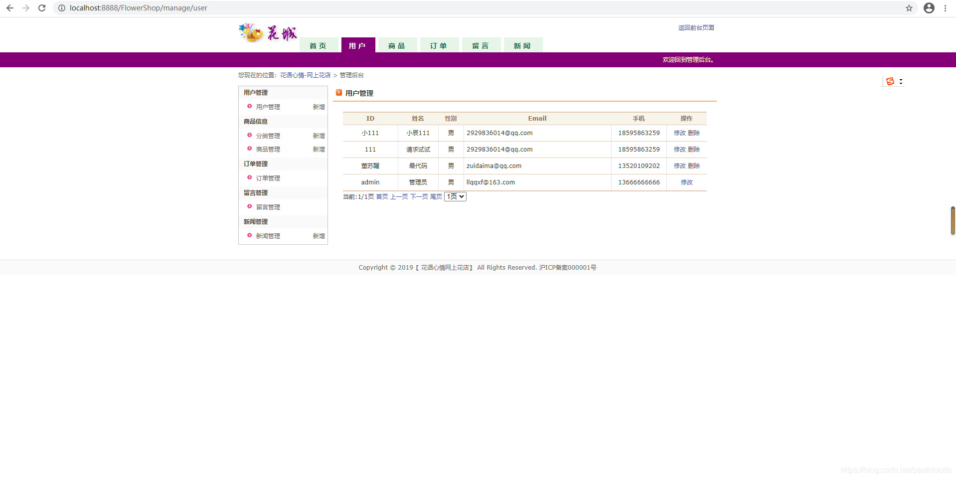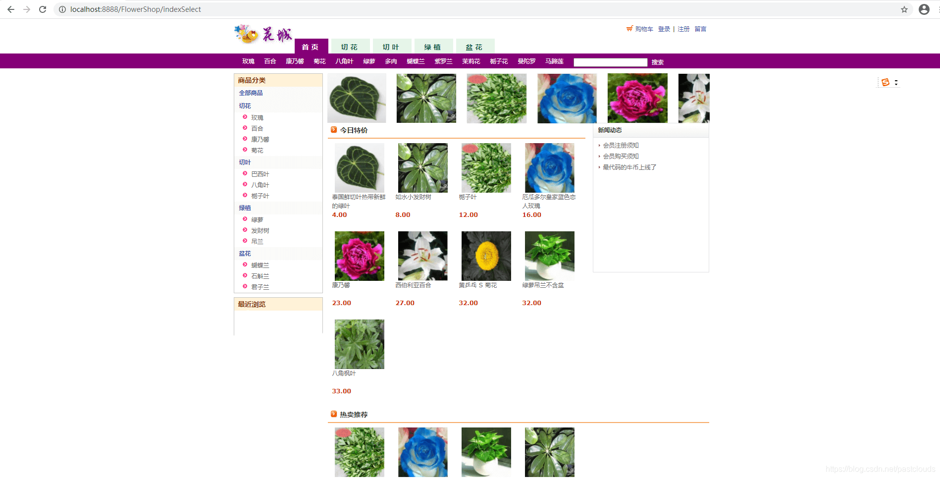 功能: 一套完整的网上花店商场系统,系统支持前台会员的注册 登陆系统留言,花朵的品种选择,详情浏览,加入购物 车,购买花朵等;后台支持管理员的花朵种类添加,花朵 详情的添加修改,用户管理,留言管理,商场新闻管理等。