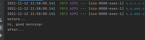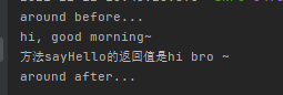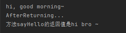 当我访问"/hi"时,会先执行@Before对应方法,输出"before…",再执行HiController 中的sayHello方法,输出"hi, good morning~",并且返回"hi bro ~",最后执行@After对应方法,输出"after…"