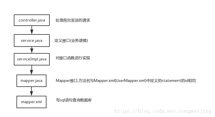 Controller-->service接口-->serviceImpl-->dao接口-->daoImpl-->mapper-->db