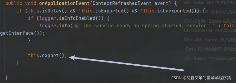 可以看到这个类实现了ApplicationListener<ContextRefreshedEvent>,这样就会在Spring IOC容器刷新之后调用onApplicationEvent方法,这个方法中做的就是服务暴露。