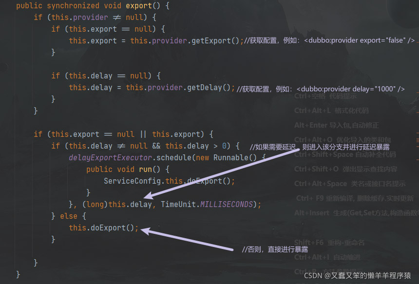 从if判断条件中,我们可以看到如果配置中没有设置延迟暴露、并且没有暴露过、并且支持暴露的情况下就会执行this.export(),最终会调用父类ServiceConfig中的export方法。
