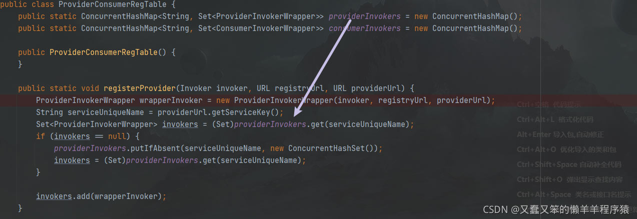 上述操作主要是讲export转化为exporter,获取注册中心的相关配置,如果需要注册则向注册中心进行注册,并且在ProviderConsumerRegTable中记录服务提供者信息,进入源码中,我们发现实质就是往一个ConcurrentHashMap中塞入invoker,key是服务接口全类名,value是一个set,set中存储包装过的invoker。