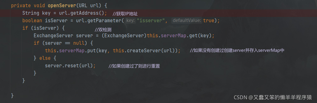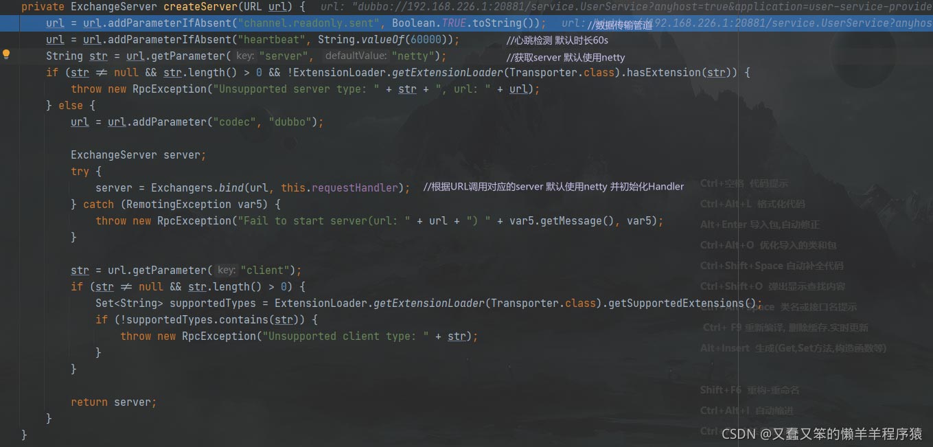 上述代码中,主要就是根据URL创建出key,然后将key和invoker存入exporterMap中关联起来,如果是初次服务暴露则需要创建监听服务器,默认是NettyServer,并且初始化各种Handler,比如心跳检测,解码等。