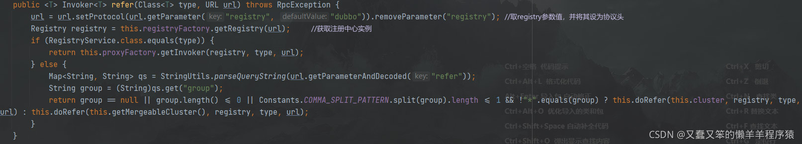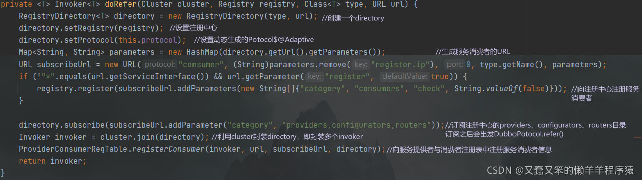 在上面URL的截图中,我们可以看到此时的协议是registry,因此会调用RegistryPotocol.refer()