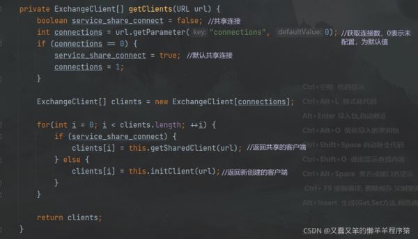 重点在getClients()方法中,这个方法是用于获取客户端实例的,实例类型为ExchangeClient[],底层依赖Netty进行通讯,并且是默认共享连接的。