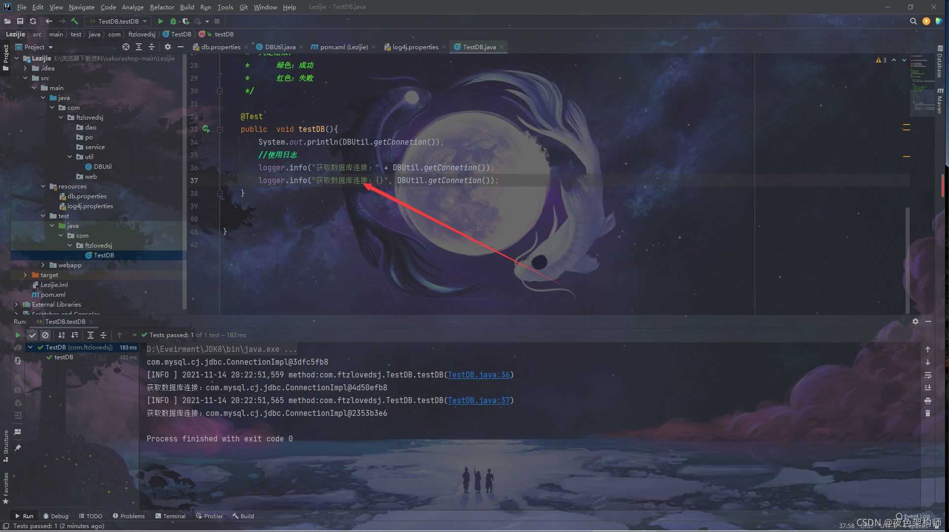 在写好连接后我们需要写一个测试类来判断数据库是否真正连接成功: