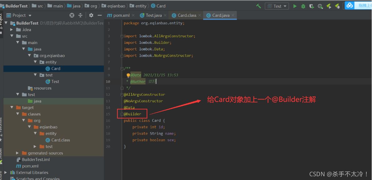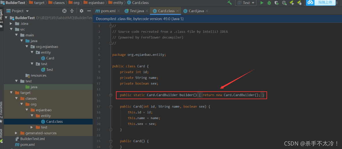 实体类加上@Builder注解之后,编译之后会多出一个builder()方法,和一个CardBuilder静态内部类,如下图: