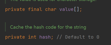 字符串常量池中当存储一个字符串常量时会在根据哈希函数计算的某一个位置处产生一个结点,结点是由哈希值、String结点的地址、存储该数组位置处的下一个结点的地址组成的(这在JVM的原码中才能真正了解)。而每一个String结点是由字符型数组value与哈希值hash(默认为0)构成的 (下图所示)。点入String看其原码时就能够会发现这两个变量。此时观察到value数组被final修饰则说明该数组里的字符是不能够被改变的,这就是字符串是一个常量的原因,并且该字符串会转换为字符形式存放在字符数组当中。