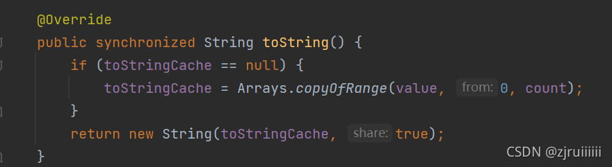我们对第一和第二种创建字符串的方法都已经非常熟悉了,那至于为什么第三种能够传入一个字符数组变为字符串,我们可以按住ctrl键点入传入字符数组的String当中看其原码,我们能够发现此时是利用的方法是数组的拷贝,将字符数组的所有字符改为字符串形式。
