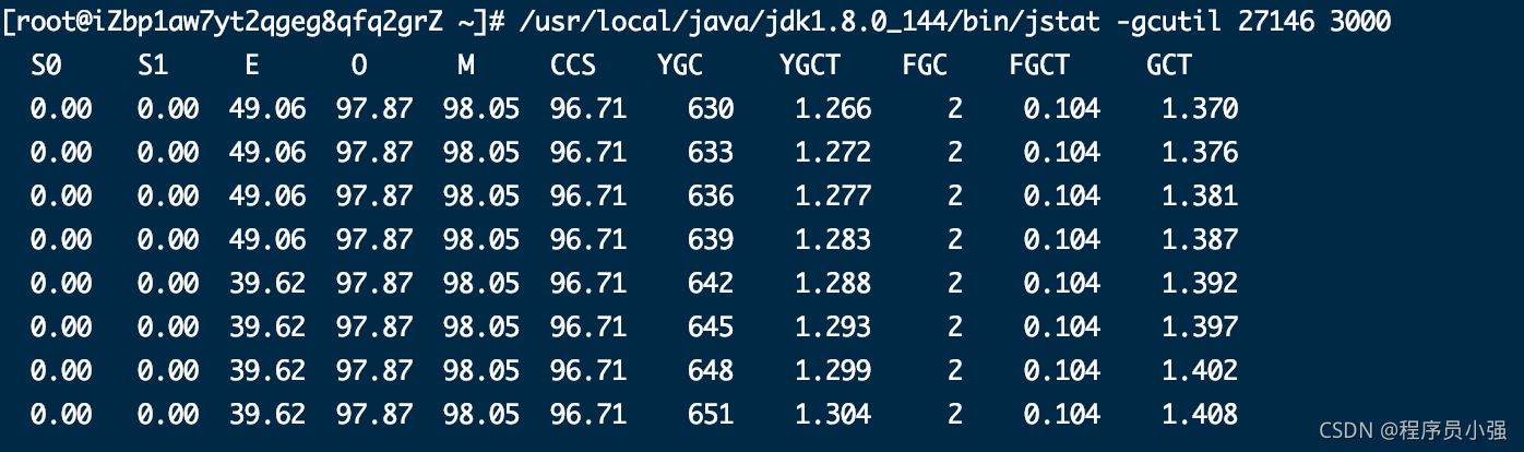s0、s1:表示两个survior区域的使用百分比e:eden区域使用百分比o:老年代使用百分比m:metaspace(元数据空间)使用百分比ygc:新生代gc次数ygct:新生代gc累计总时间fgc:full gc次数fgct:full gc累计总时间gct:gc累计总时间