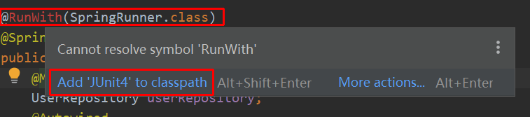 这里如果不添加的话,在使用@RunWith注解的时候也会提示你添加,点击Add ‘JUnit4' to classpath也会自动在pom.xml帮你添加