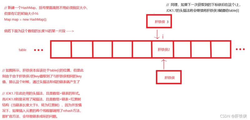 如图左下角描述所示的情况,当数组table下标出现了相等的情况的时候,此时此刻还是将肝铁侠2的值赋值给tablle[i]的,这里讲述的是JDK1.7版本下HashMap中插入的头插法,而JDK1.8版本中是用的尾插法。插入以后,我们要让数组指向链表的头部,那么链表的头部也就是头节点是不是就是table[i]的位置呀。