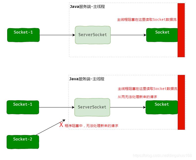 // 因为程序阻塞读取第一个socket连接的数据流,没有其他线程资源去读后面建立的socket了