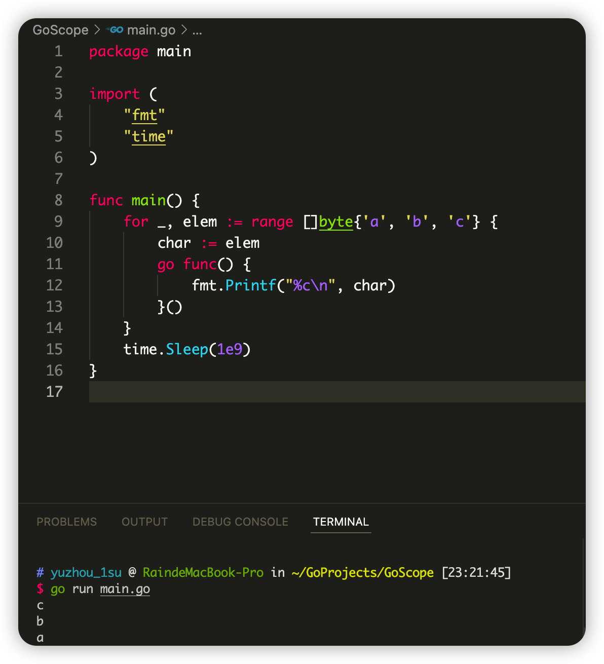 当我们复制变量时,我们创建一个新变量并将 elem 的值分配给它。我们在每次迭代中都这样做,这意味着对于每个步骤,我们都会创建一个新变量, goroutine 会引用该变量。每个 goroutine 都有一个对不同变量的引用,并且它也可以正常工作。
