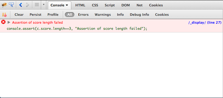 在JavaScript程序的开发和维护过程中,Assert(断言)是一个很好的用于保证程序正确性的特性。在具备调试工具的浏览器上,这一特性可以通过调用console.assert()来实现。比如在以下代码中,console.assert()语句保证cat对象的score变量值长度为3: