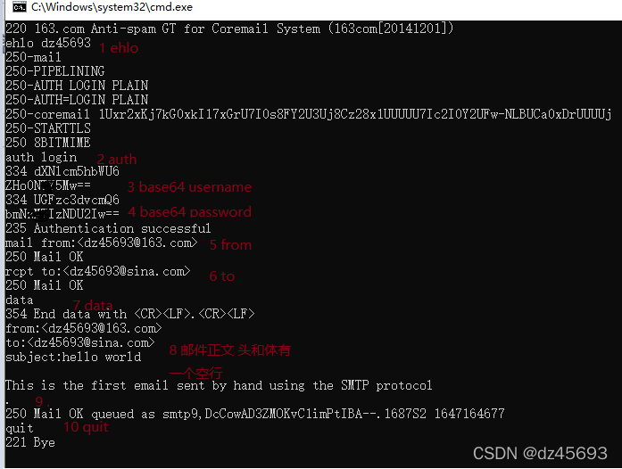 telnet smtp.163.com 25 [outpout] ehlo dz45693 [outpout] auth login [outpout] 输入用户名base64 [outpout] 输入密码base64 mail from:<dz45693@163.com> [outpout] rcpt to:<dz45693@sina.com> [outpout] data [outpout] from:<dz45693@163.com> to:<dz45693@sina.com> subject:hello world This is the first email sent by hand using the SMTP protocol quit