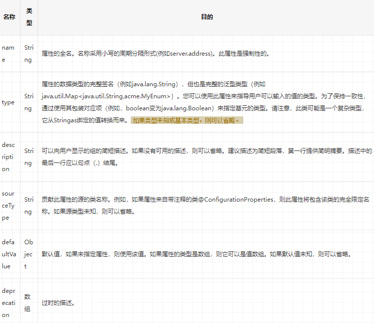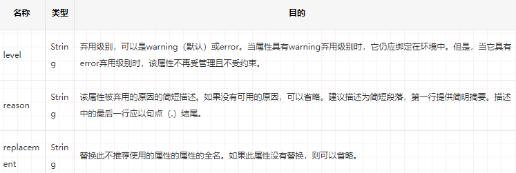 deprecation每个properties元素的属性中包含的JSON对象可以包含以下属性: