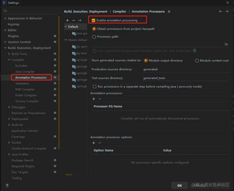 在idea设置中搜索Annotation Processors,接下来勾住Enable annonation processing就完成了。在编译打包后的文件中看到自动生成的spring-configuration-metadata.json。这个文件不用我们编写