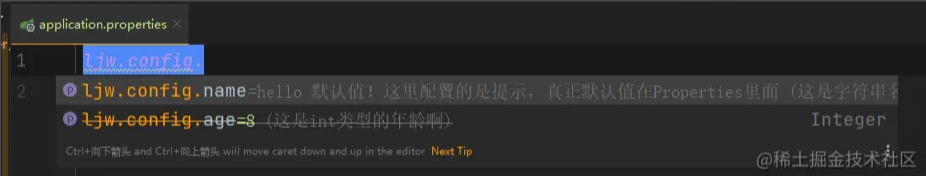 配置additional-spring-configuration-metadata.json文件后,在开发人员的IDE工具使用个人编写的配置读取很有效的在application.properties或application.yml文件下完成提示。