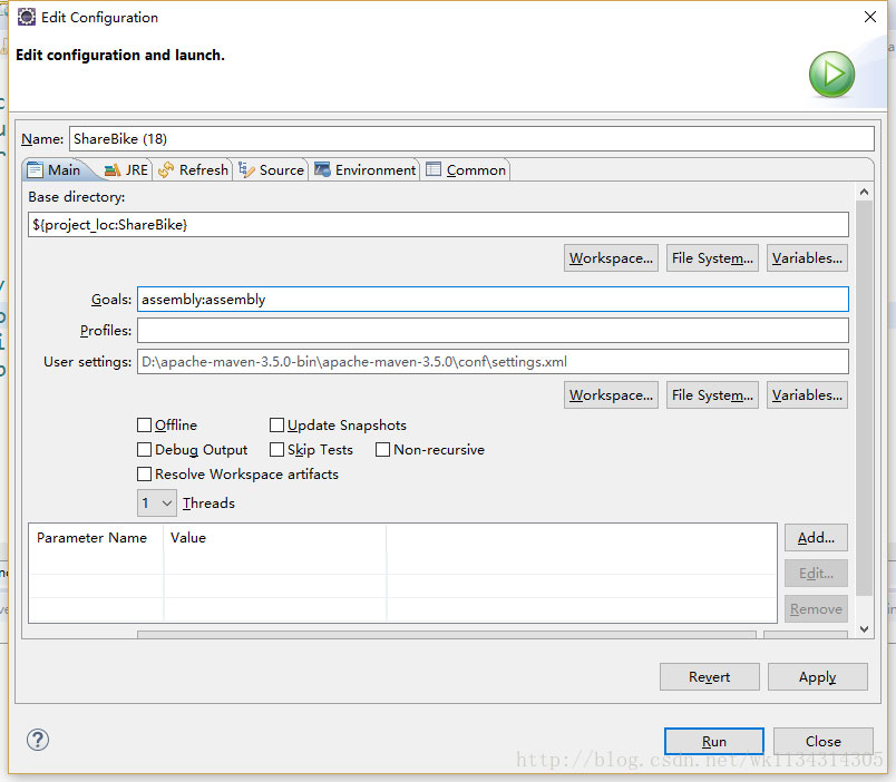 在Main窗口下的Goals里填写assembly:assembly,然后点击run就可以了。