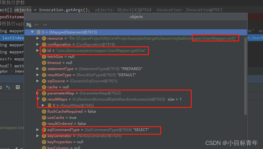 ① 拿出执行参数,里面有很多东西给我们用的,我本篇主要是用MappedStatement。大家可以发挥自己的想法。 打debug可以自己看看里面的东西。