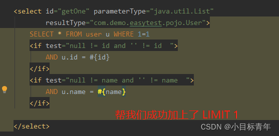 针对一些使用 单个实体类去接收返回结果的 mapper方法,我们拦截检测,如果没写 LIMIT 1 ,我们将自动帮忙填充,达到查找单条数据 效率优化的效果。