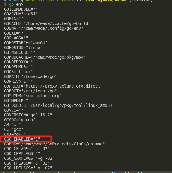 Go 语言通过 cgo 工具来识别代码中的 C 语言,我们可以通过命令 go env 来查看是否 cgo 工具是否开启。