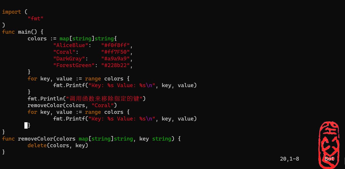 // 删除键为 Coral 的键值对delete(colors, "Coral")// 显示映射里的所有颜色for key, value := range colors {<!--{C}%3C!%2D%2D%20%2D%2D%3E-->fmt.Printf("Key: %s Value: %sn", key, value)}// 删除键为 Coral 的键值对