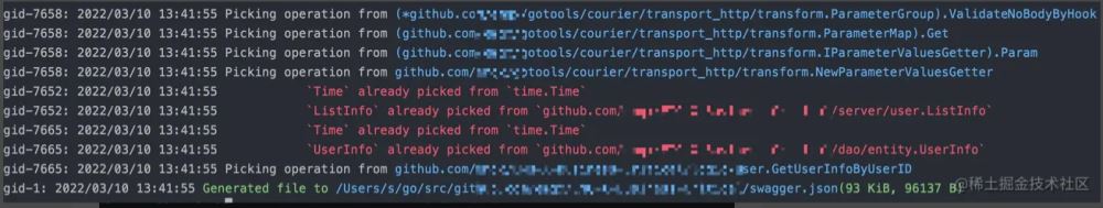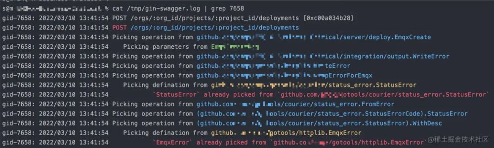 cmd.Execute()这样修改后,每次 gin-swagger 调用 log 打印日志都时候, 都会使用我定义的 Write 方法, Write 方法中每次打印前都会先查询出当前的 goroutine_id ,然后作为日志的前缀。