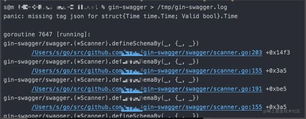 在使用 gin-swagger 的过程中, 经常会发生因为缺少 json 等 tag 而导致的异常。 由于 gin-swagger 是并发执行的, 输出的日志本身是错位的。 这就导致无法定义是哪一个结构体缺少 tag 导致的。