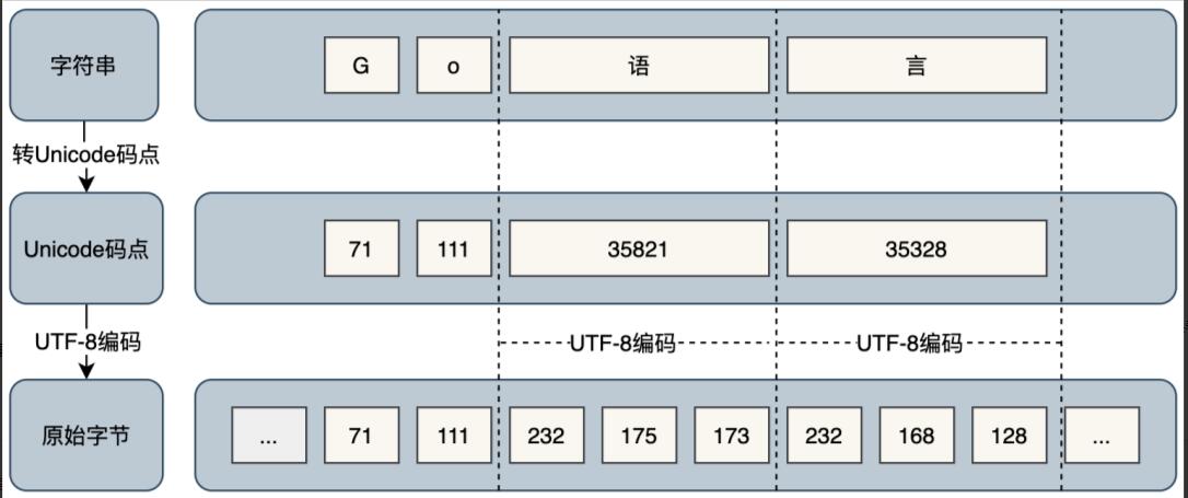 s := "Go语言编程" // byte fmt.Println([]byte(s)) // 输出:[71 111 232 175 173 232 168 128 231 188 150 231 168 139] // rune fmt.Println([]rune(s)) // 输出:[71 111 35821 35328 32534 31243]