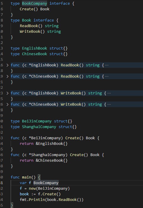 }第二步:创建 中文书 和 英文书 两个“类”,并且分别实现两种方法。(注:golang种没有类,只有组合。应贺总强调,特别说明)