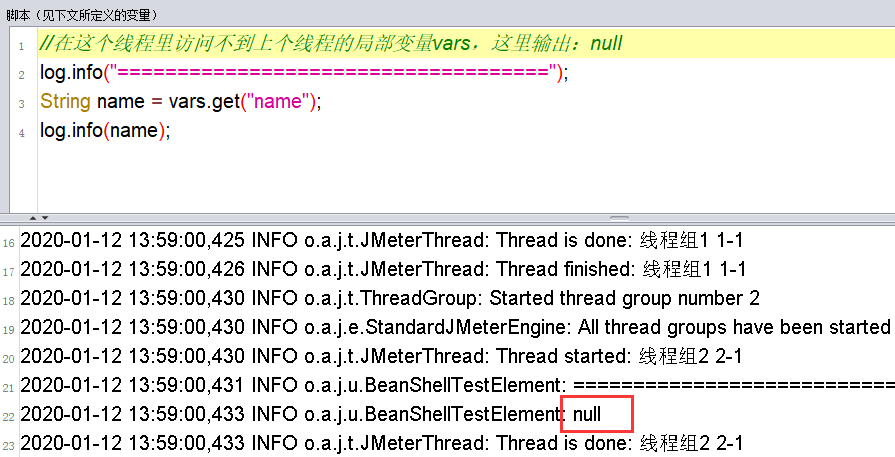 在线程组2里面去访问vars变量,输出null,可见vars确实是个局部变量: