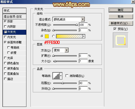 外发光:混合模式“颜色减淡”,颜色为橙黄色:#ffe500,其它设置如下图。