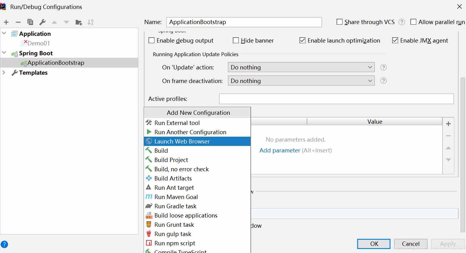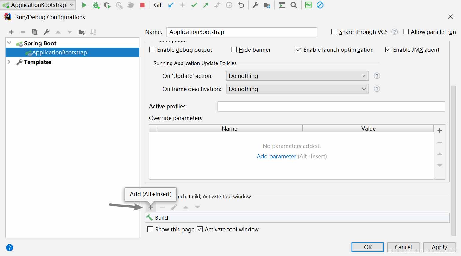 编辑启动类(我的启动类是ApplicationBootstrap) => 进去后找到图中标记处Add按钮