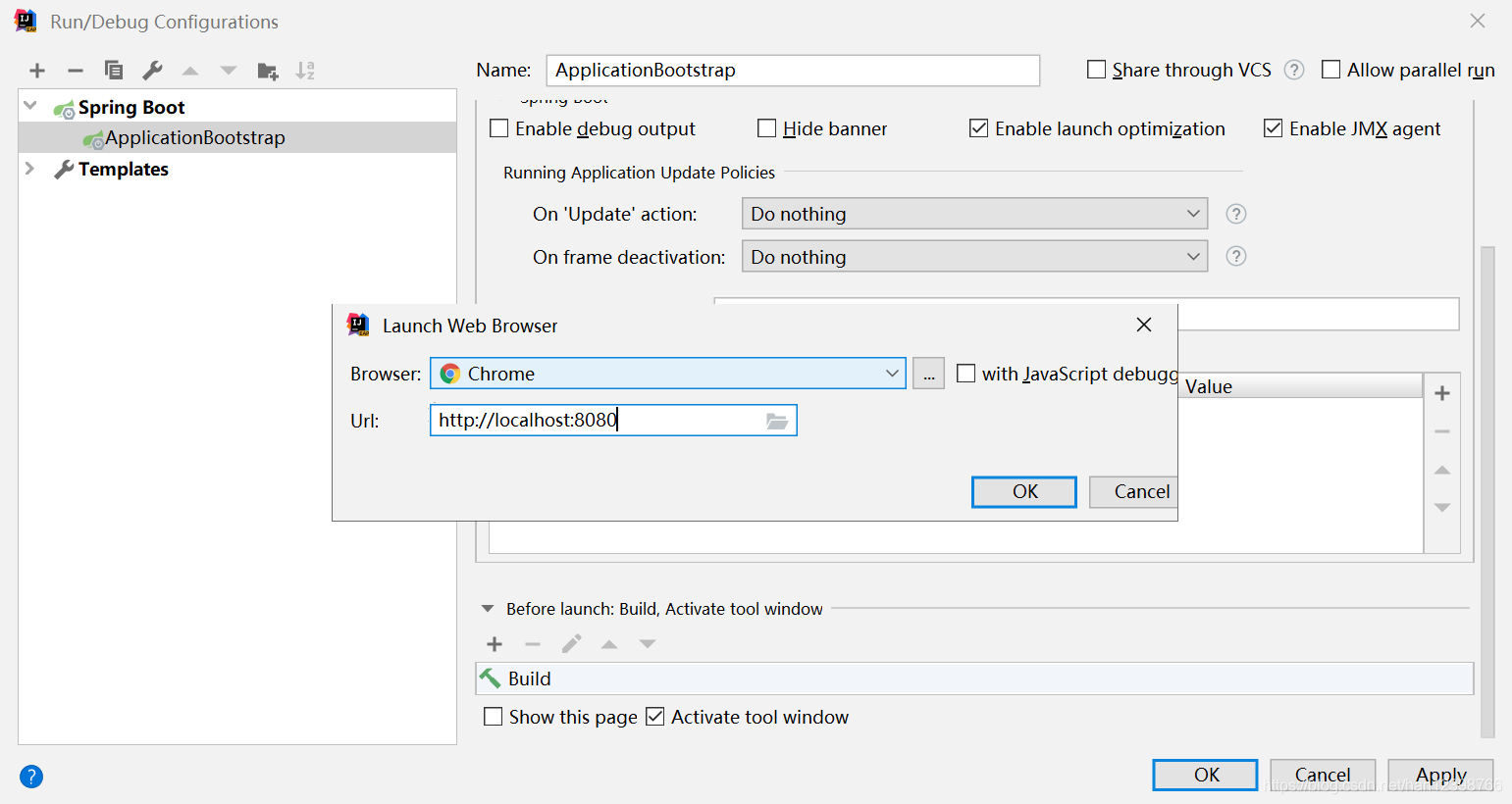 选中菜单中的 Launch Web Browser => 选择浏览器 => 输入打开网址 => 保存后项目启动